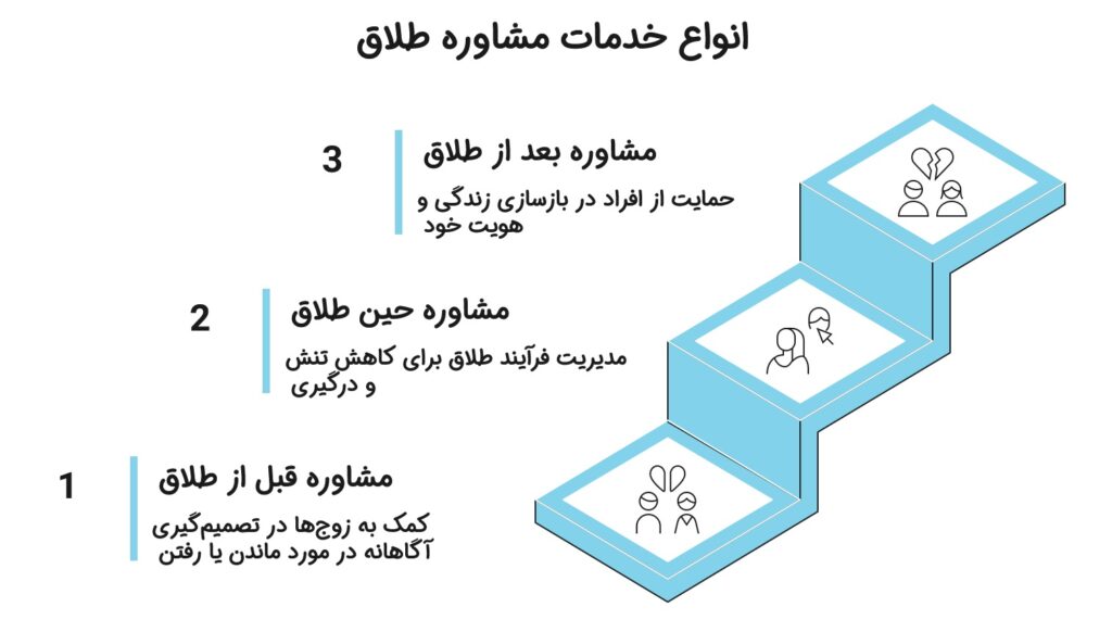 مشاوره فرآیند طلاق: اگر تصمیم به جدایی قطعی شده باشد، هدف این نوع مشاوره طلاق، کمک به شما برای طی کردن این مسیر با کمترین آسیب روانی، عاطفی و مالی است. تمرکز بر مدیریت هیجانات، همکاری در مورد مسائل مربوط به فرزندان و رسیدن به یک جدایی محترمانه است.